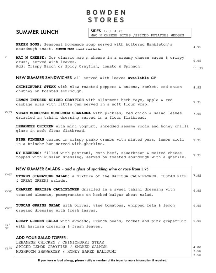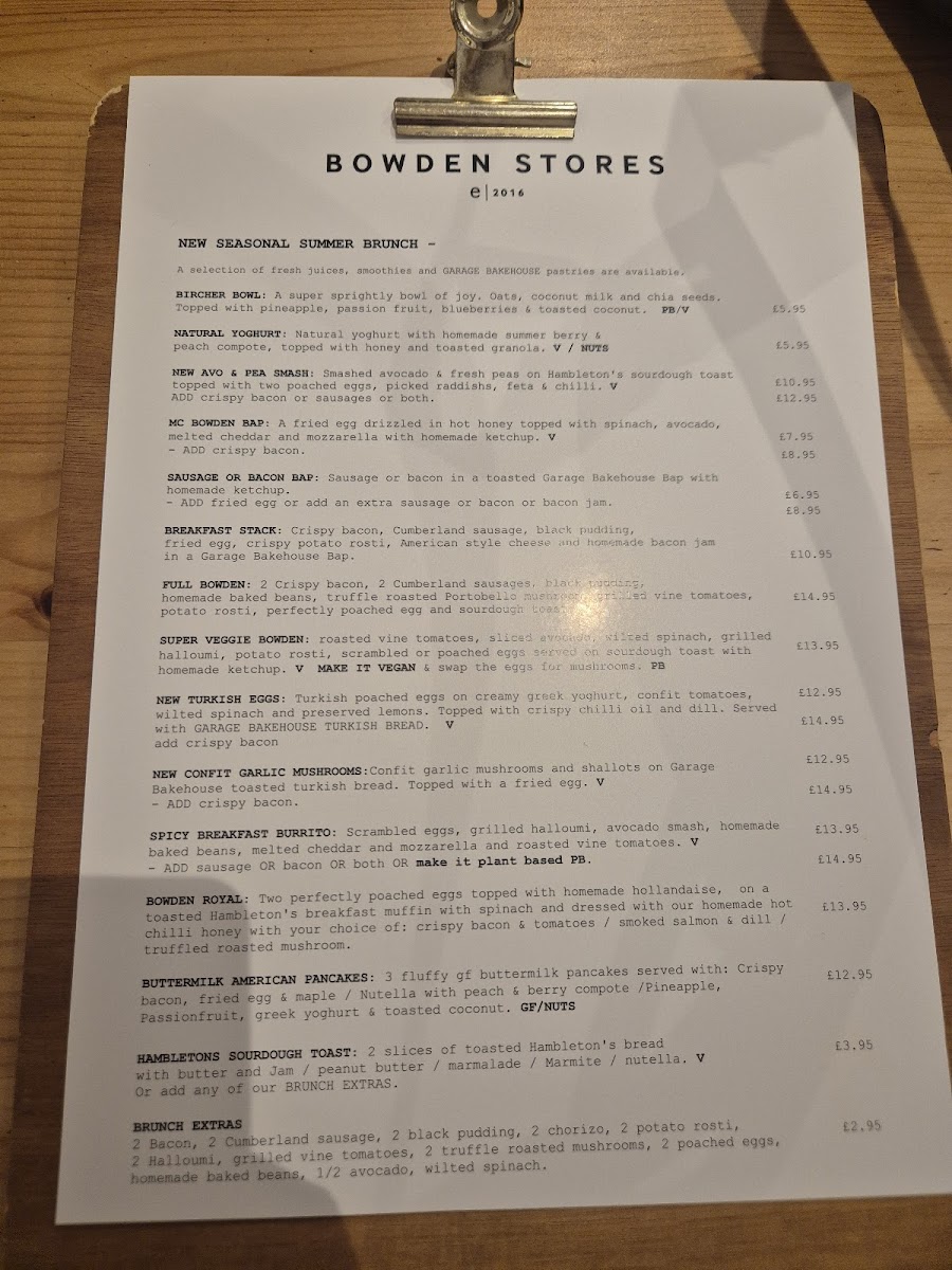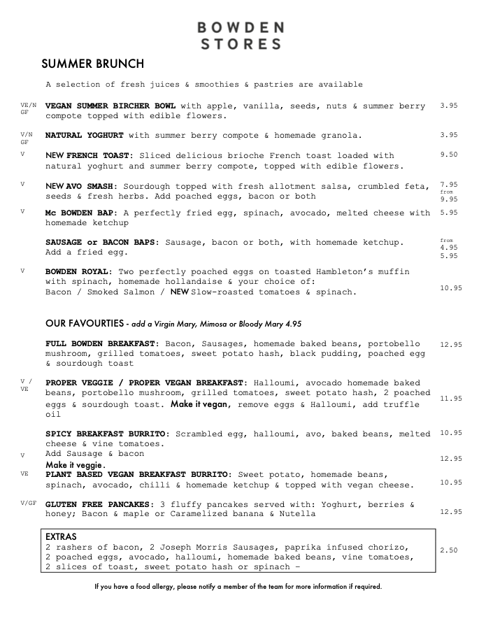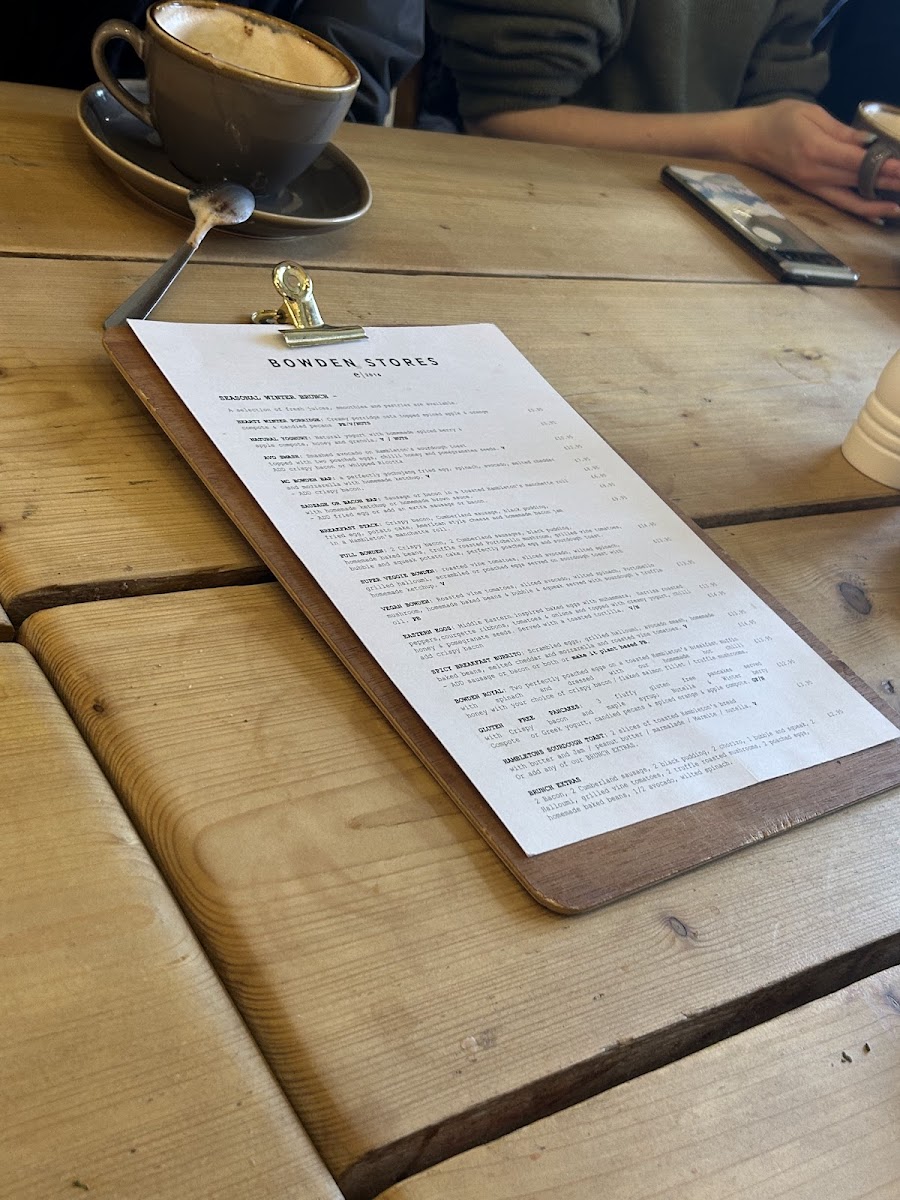 The menu at Bowden Stores strikes a confident balance between comforting classics and lighter, more modern plates, with a clear focus on quality ingredients and well-judged flavors. The breakfast and brunch selection feels especially well considered, moving from dependable staples like Full English Breakfast and Eggs Benedict to more relaxed choices such as Avocado on Toast and Buttermilk Pancakes, each designed to satisfy without being fussy. For mains, the kitchen leans into hearty, crowd-pleasing dishes-think Fish and Chips, Steak and Ale Pie, and a properly rich Beef Burger-while still keeping options open for those after something fresher, like Caesar Salad or a seasonal soup. Small plates and sides round things out neatly, making it easy to share or build a meal to your appetite, and the dessert list finishes on familiar, satisfying notes with choices like Sticky Toffee Pudding and Cheesecake. Overall, it reads like a menu built for repeat visits: approachable, varied, and structured so that whether you’re stopping in for a quick bite or settling in for a full meal, there’s a clear through-line of comfort, consistency, and good taste.